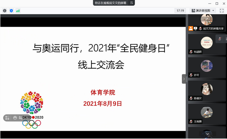 随着奥运圣火缓缓熄灭,第32届夏季奥林匹克运动会在东京新国立竞技场的夜色中落下帷幕,第十三个“全民健身日”也如期而至。为进一步诠释中华体育精神,营造全民健身的浓厚氛围,8月9日下午,beat365唯一官方网站举办以“全民健身与奥运同行”为主题的线上交流会。体育教育系主任徐五所老师、班主任和辅导员老师、以及全体学生参会。会议由辅导员屈文文主持。