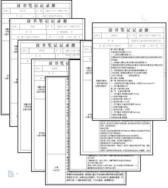 暑假期间,团队成员严格按照要求,认真阅读《孤独症儿童训练指南活动指引3》、《如何发展自闭谱系障碍儿童的认知能力》、《游戏中的教育》、《感觉统合训练教学指导手册》和《特殊儿童早期干预》等约20本相关书籍,积极撰写读书笔记,并通过腾讯会议的形式定期开展读书分享会,与其他成员互相交流、分享读书心得与体会,汲取书中精华,深入了解培智学生,深悟课程创编真谛。
