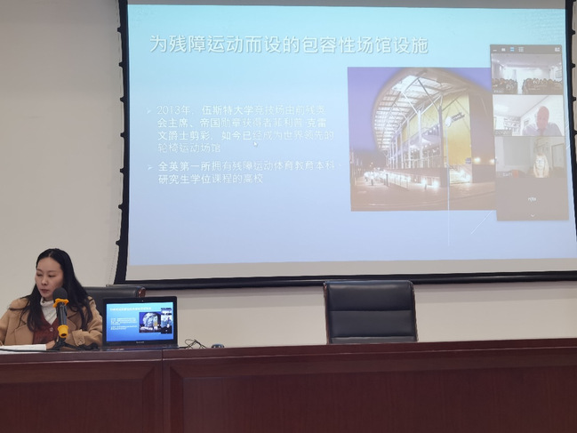 随后,鲍勃教授介绍了英国伍斯特大学的办学特色以及球类竞技等方面的项目优势,同时详细地介绍了伍斯特大学包容性体育教学法,提到了在伍斯特大学具有多种竞技体育包容性课程,聋人手语课程以及各类球类课程等,还展示了残障运动体育教育资质实例。