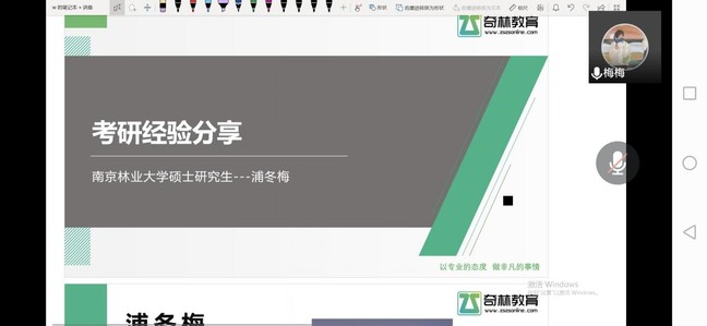青春由磨砺而出彩,人生因奋斗而升华。正值考研准备期,3月18日晚,beat365唯一官方网站邀请了奇林教育考研分析师、南京林业大学硕士研究生浦冬梅,为beat365唯一官方网站19级、20级和21级84名学生进行了硕士研究生招生备考线上专题讲座。