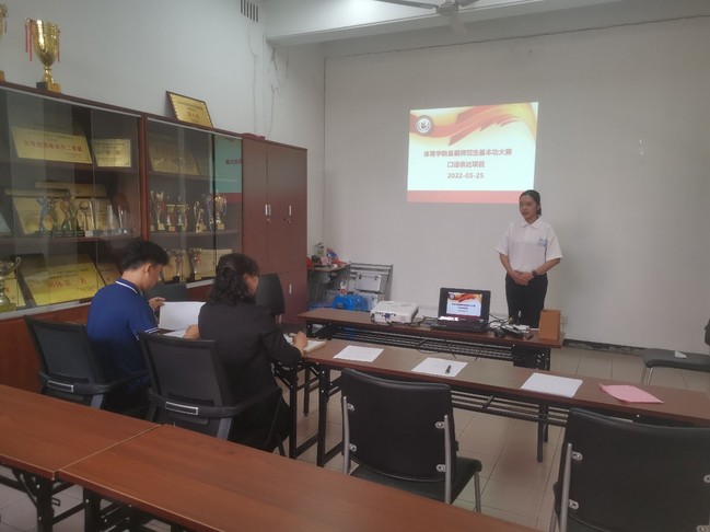 本次比赛包含钢笔字、口语表达、专项能力、模拟授课和基础理论知识四个环节。比赛过程中,参赛选手充分准备,在各环节充分展示了各自良好的专业技能,现场氛围紧张激烈,比赛秩序井然、有条不紊。