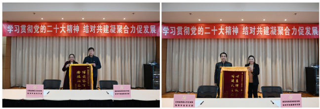 beat365唯一官方网站副院长仝伟代表学院全体师生向文体中心赠送了锦旗,张启昕书记代表直属党支部向文体中心党支部赠送锦旗,双方党组织负责人签署了结对共建协议书。