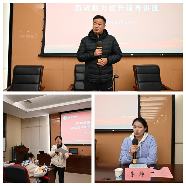 专任教师李烨以体育应届毕业生的视角,分享了她的面试经验。她指出,面试前应当保持充分的休息、合理安排每日试讲计划、做好自我介绍、制作好简历;面试过程中,特别是在结构化面试过程中,理清思路是关键,可以按照“分析问题、解决对策、总结反思”的思路进行。她强调应对面试,每一位同学都应放平心态,关注的焦点更多地集中在面试本身。她提醒同学们“求职,不是一个人在战斗,学校与学院是每一位同学的坚强后盾!”
