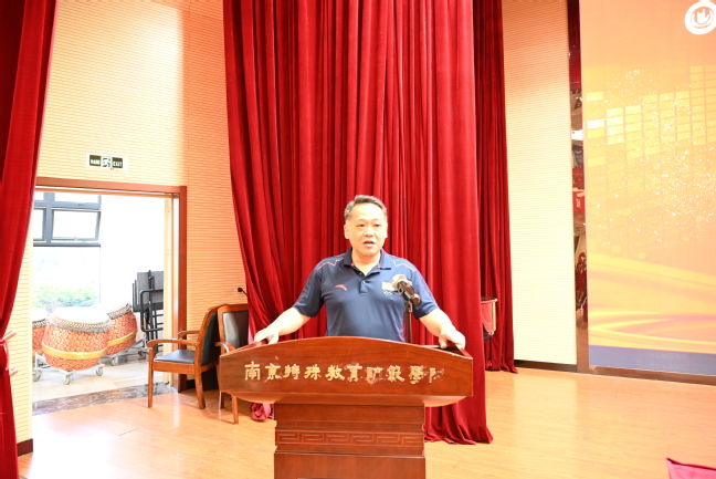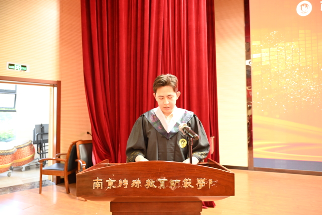 优秀毕业生许可同学代表全体毕业生发言,他回望在南京特师的点滴成长,感谢母校的培养,并立志将“博爱塑魂”的校训精神融入到“大学生志愿服务乡村振兴计划”的工作岗位中,扎根基层为苏北农村的村民做好服务。