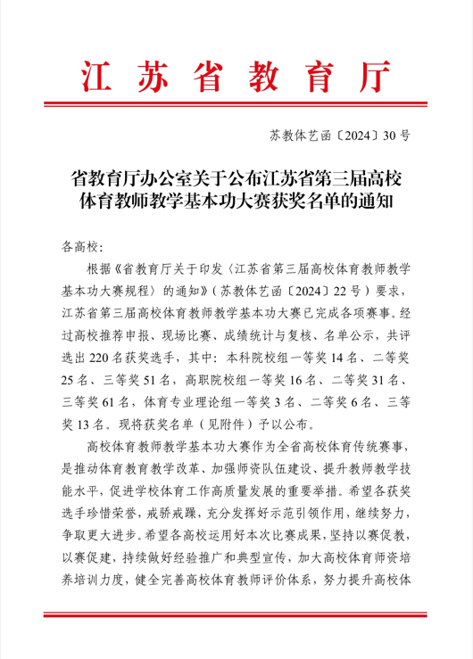 近日,省教育厅公布了江苏省第三届高校体育教师教学基本功大赛的获奖名单。在此次大赛中,beat365官网两位教师李烨和夏博艳分别在足球和排球组、跆拳道和武术组别中获得二等奖,展现了高水平的教学技能和专业素养。