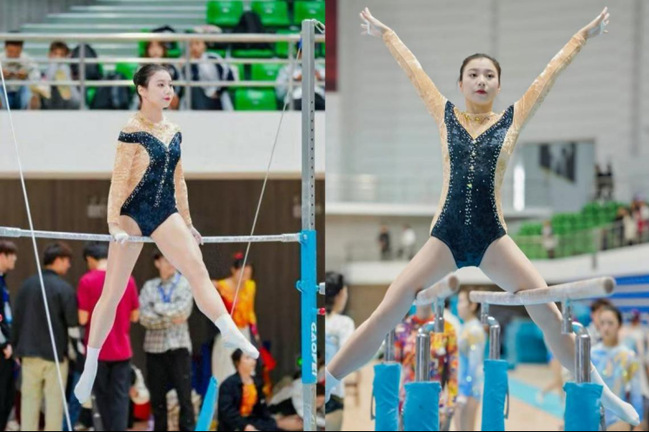 在女子全能的角逐中,秦玥同学以一套融合传统武术元素的自由操脱颖而出。她身着水墨纹饰体操服,将太极拳的刚柔并济与竞技体操的腾跃技巧巧妙结合,最终站上自由操单项季军领奖台,同时斩获女子全能第三名的好成绩。