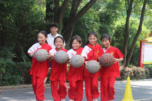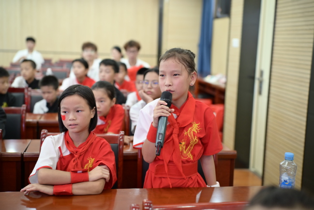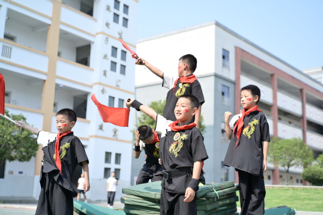 随后,五大主题关卡沿着井冈山斗争的历史脉络次第展开,将“党指挥枪”“星火燎原”“人民战争”“艰苦奋斗”的精神内核,巧妙转化为孩子们可感可触的团队挑战。 孩子们在 “三湾改编·整编同行” 关紧紧手挽手,化身革命队伍,协作运送篮球,在蜿蜒的“改编之路”上迂回前行,亲身体悟“党指挥枪”原则下铁一般的纪律与团结力量;“朱毛会师·薪火相传” 关点燃激情,孩子们分组接力,小心翼翼传递象征革命火种的乒乓球,最终在象征“井冈山巅”的高处奋力挥动国旗,感受两大革命洪流汇合的澎湃与信念的传递; “土地革命·分田护粮” 随即展开,孩子们穿越敏阶梯与小栏架模拟的崎岖险阻,争分夺秒“抢收”并精准分装运送黄豆,在紧张协作中深刻体会“打土豪分田地”所彰显的人民伟力与群众路线智慧;“黄洋界保卫战·竹钉御敌” 考验智慧与协作,孩子们专注地将竹签插入纸箱布设模拟竹钉阵,并将飞盘精准投向靶心,生动演绎军民同心、众志成城击退强敌的英勇与智慧;最艰苦的“挑粮小道·官兵同心” 考验在楼梯间进行,孩子们背负“粮袋”攀登,在特定楼层铿锵朗诵革命诗词获取通行。终点会议室内,活动在激动人心的“经典复刻”中推向高潮——孩子们模仿历史油画中毛泽东与朱德胜利握手的场景,深情演绎跨越时空的对话;一句句 “朱军长,革命的火种保住了!”“工农武装割据的道路,就从井冈山开始!”的台词,仿佛将同学们带回了那个热血沸腾的年代。最后,59名儿童齐声合唱《我们是共产主义接班人》,他们脸上贴着小国旗、戴着红领巾、挥舞着手中的党旗,歌声洪亮,神情赤诚专注。