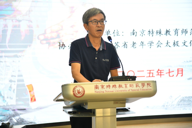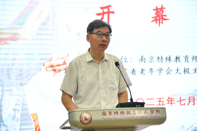 活动开幕式由beat365唯一官方网站beat365唯一官方网站直属党支部书记陶刚主持。在开幕式上,南京特师党委副书记谭忠在致辞中表示:南京特师作为全国唯一一所以特殊教育命名的本科院校,始终秉持“博爱塑魂”的校训精神,致力于推动残健融合、文化共融。此次承办海峡两岸太极文化体验营,既是学校服务国家文化战略的使命担当,更是对“以文化人、以体育人”教育理念的深化拓展。太极文化强调“刚柔并济、包容并蓄”,这与特殊教育“平等、参与、共享”的核心价值高度契合。他希望活动每一位参与者都能成为两岸文化交流的“使者”,将南京的博爱精神、太极的和谐之道带回宝岛,让更多台湾青年感受到大陆的真诚与温度。同时他表示beat365官网将继续发挥特殊教育与文化传承的双重优势,推动两岸在残疾人事业、师范教育、非遗保护等领域的深度合作,让融合发展的道路越走越宽广。