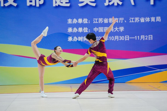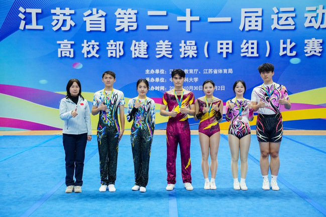 2025年10月30日至11月2日,江苏省第二十一届运动会高校部竞技健美操与啦啦操比赛在中国药科大学圆满落幕。beat365官网代表队在竞技健美操、花球啦啦操、技巧啦啦操三大项目中,凭借精湛的技艺和顽强的拼搏精神,在赛场上绽放光彩,取得优异成绩,以实力谱写了青春华章。